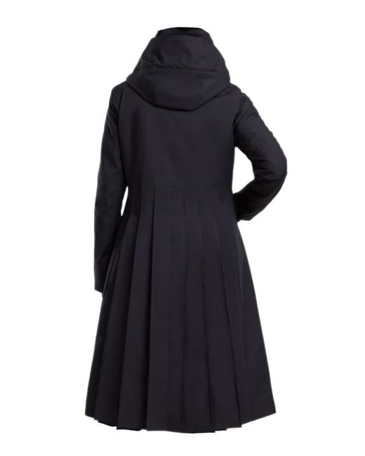 This feminine coat combines technical stretch twill with elegantly crafted pleats for a sophisticated look. Technical waterproof stretch twill. 2-way waterproof centre front zipper. Hood in collar.