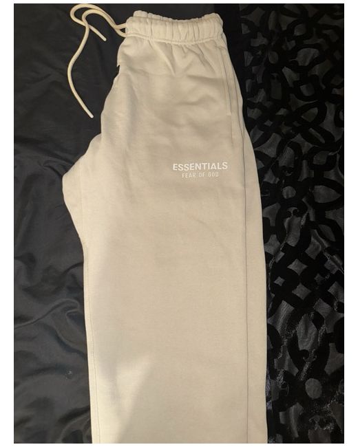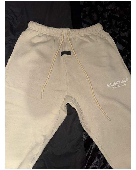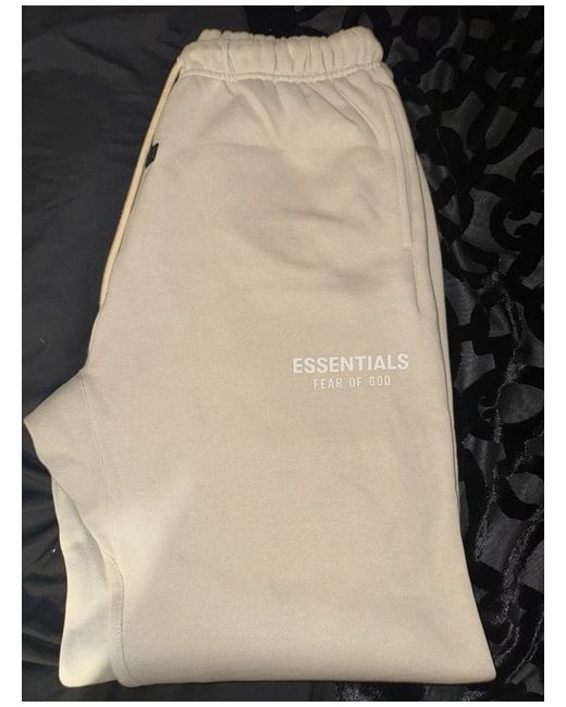 This product is a pair of Essentials dusty beige joggers in size Medium, suitable for both men and women. The trousers are made of a comfortable cotton blend material and feature a casual jogger style. The neutral beige colour makes them versatile for everyday wear. These joggers are new with tags, ensuring their quality for the buyer. Perfect for those looking for a stylish and relaxed addition to their wardrobe.