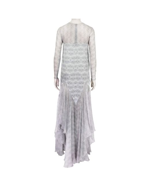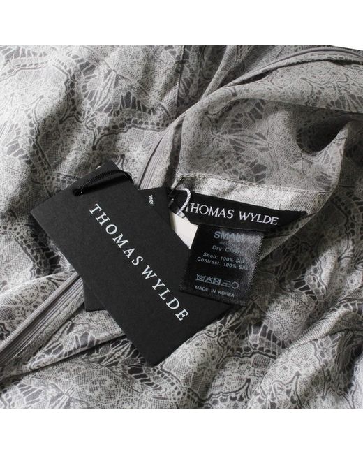 Thomas Wylde Gown Thomas Wylde Butterfly Patterned Silk Gown Colour: Pale grey tonesMaterial: 100% silkAn elegant full-length dress with fluid hem by Thomas WyldeLuxurious satin and sheer chiffon fabricSlim fitting to the upper body and sleevesConcealed zip fastening to the sleevesSemi sheer to the upper body and hemlineConcealed zip fastening to the back.