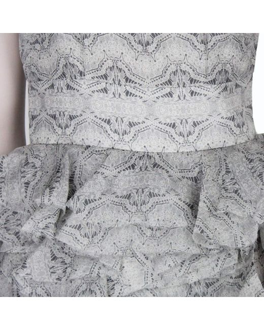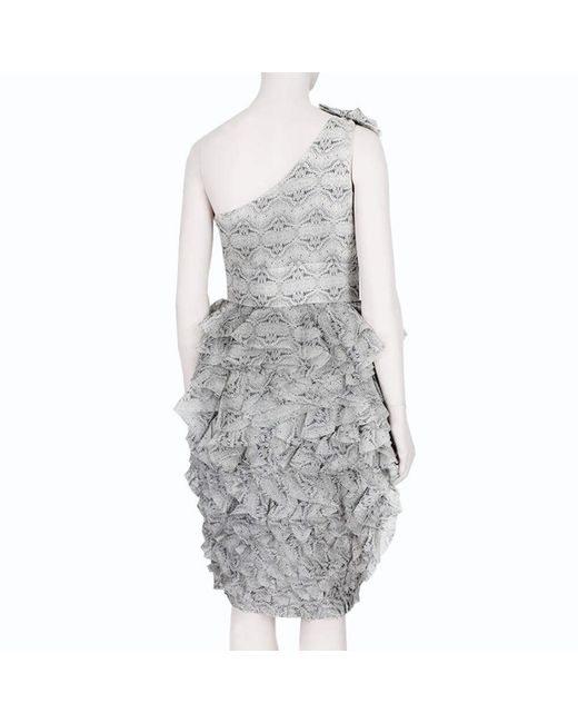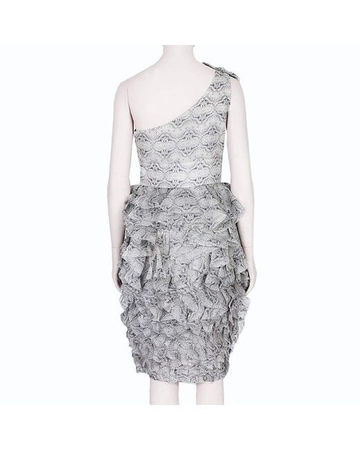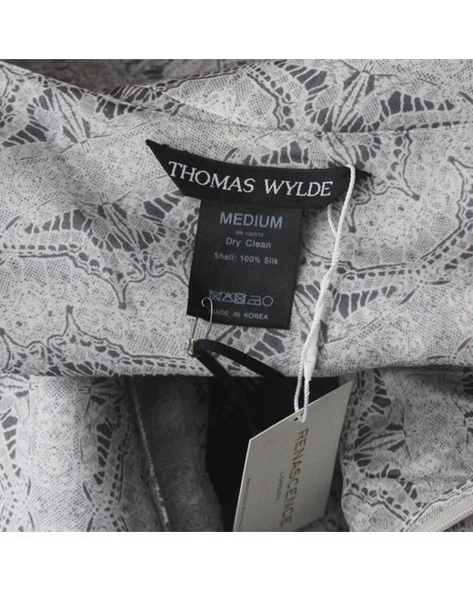 Thomas Wylde Grey Butterfly Print Layered Silk Chiffon Dress. Thomas Wylde butterfly patterned layered silk chiffon dress. Colour: Pale grey. Pale grey one-shoulder dress with layering to top of the shoulder.