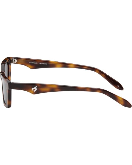 Handcrafted rectangular tortoiseshell bio acetate-frame sunglasses. · Gray polarized lenses · Logo etched at lens · 100% UVA/UVB protection · Integrated nose pads · Inset logo hardware at temples · Exposed core wires · Includes pouch Supplier color: Tortoiseshell/Smoke lenses