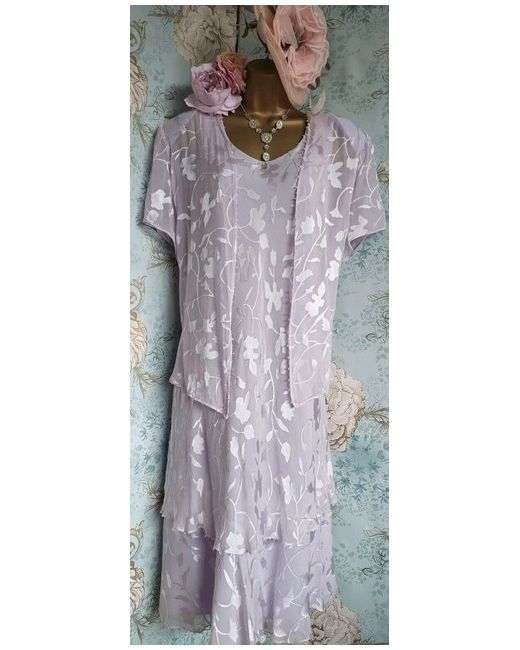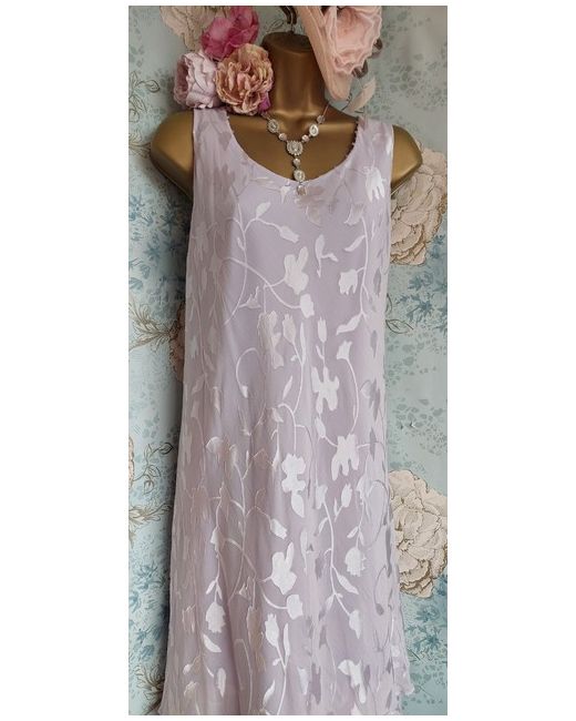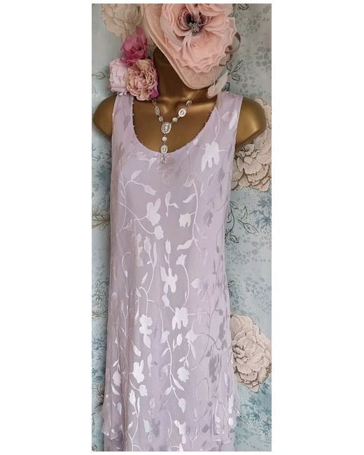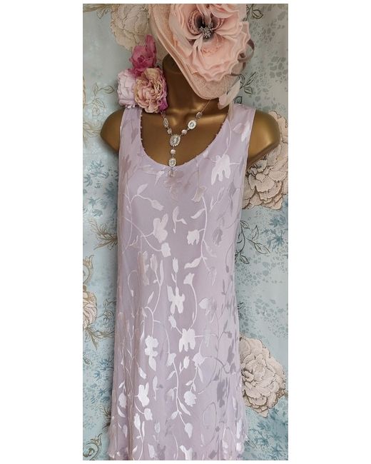 Beautiful silk dress devore burnout satin floral detail. Lilac in colour withbeaded edging layered bottom to dress. Size 18 will fit a size 20 uk also. Premium Occasion wear.