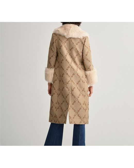 Inspired by the '70s glamour, this coat is a season statement. Crafted from an Italian wool jacquard with shearling fur at the collar and cuffs, it features a monogram pattern, designed in-house. With a neat, slim silhouette that is fitted at the body, it is fully lined and single-breasted with a 4-button closure at the front, lined patch pockets and a high back slit. Style it back with high-waisted denim or flared pants and a winter boot for full retro appeal. The real price is 1100 £