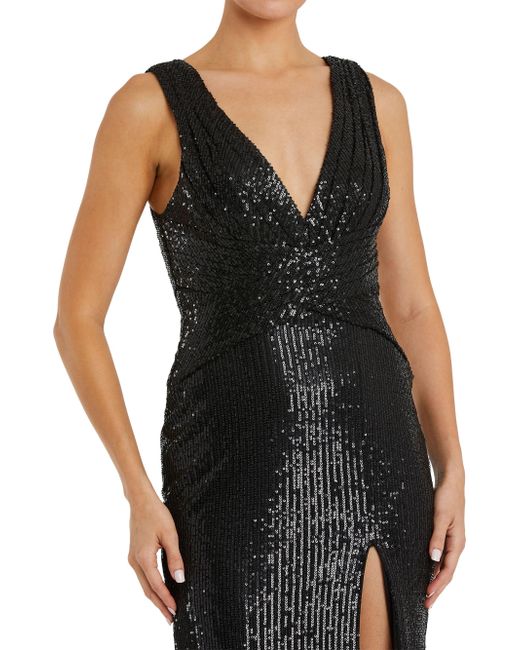 Mac Duggal's Ieena sequin features a wrap silhouette with a plunging V-neck and an ultra-high leg slit. V-neck Sleeveless Concealed back zip closure 100% polyester Spot clean Imported SIZE & FIT About 60" from shoulder to hem Model measurements: 5'10" tall Model is wearing a US size 4. Dress Collections - Mac Duggal > Mac Duggal > Saks Fifth Avenue > Barneys. Mac Duggal. Color: Black. Size: 0.