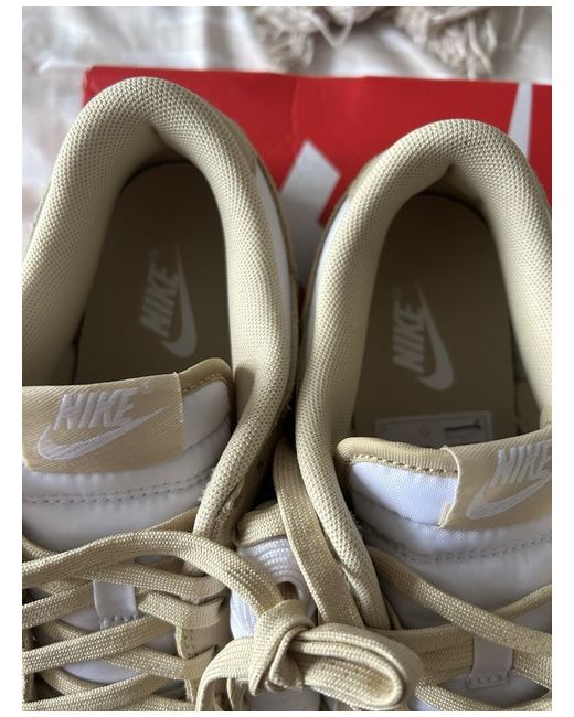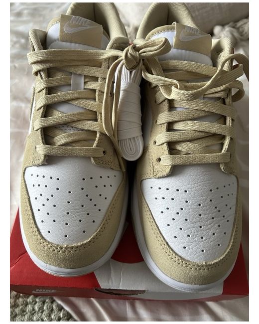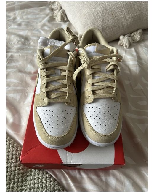 The product is a pair of women's Nike Dunks in size 7, featuring a lace-up closure and a comfortable foam insole for casual occasions. The trainers are branded with the Nike logo in a stylish beige colour, perfect for the spring season. With a standard shoe width and leather upper material, these Nike Dunks offer both comfort and style for the modern woman.