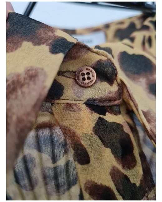 The Riani brown Leopard Patterned Long Sleeve Button Up Semi Sheer Blouse in size 14 is a stylish and versatile addition to any woman's wardrobe. Made from silk, this blouse features a classic fitted sleeve, collared neckline, and button closure. Perfect for a variety of occasions from casual to formal, this lightweight and sheer blouse is suitable for all seasons and can be machine washed for easy care. The brown spotted pattern adds a fun and trendy touch to the versatile design, making it a great choice for women who appreciate quality and style.
