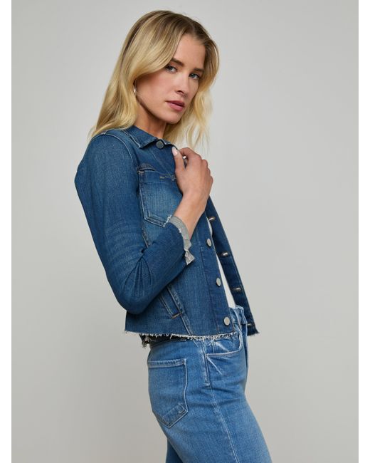 A vibrant blue denim jacket with a feminine fit and an ultra-soft feel. Luxurious stretch denim hugs the body while allowing complete freedom of movement. Timeless design features a classic collar, double chest pockets, and a front button closure. Slimming tapered seams and a raw, ravaged hem add a modern edge. L'AGENCE Janelle Denim Jacket In Authentique
