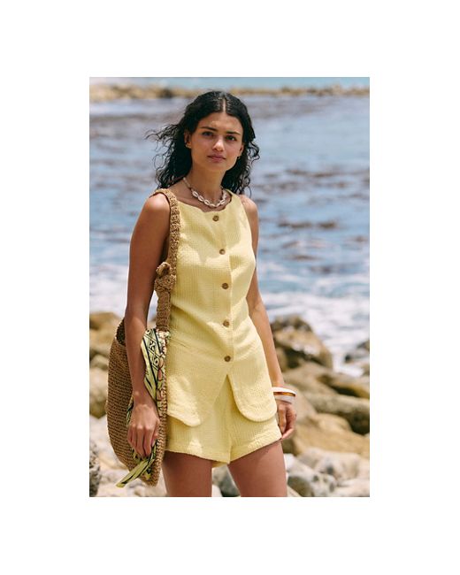 So chic with vintage-inspired charm, this set from our free-est collection will have everyone asking you, " Where did you get that?" **Fit:** Top: Longline, fitted silhouette; Shorts: Relaxed fit that sits at the natural waist **Features:** Top: High-neckline, button-up closures, peplum-style split hem, side jetted pockets; Shorts: Pull-on style, flat front and back, coordinating textured woven fabrication **Why We ❤ It:** Sleek with platforms or off-duty with sneakers, this set has endless ways to wear. Coastal Classy Set by free-est at Free People in Buttered Popcorn, Size: XS