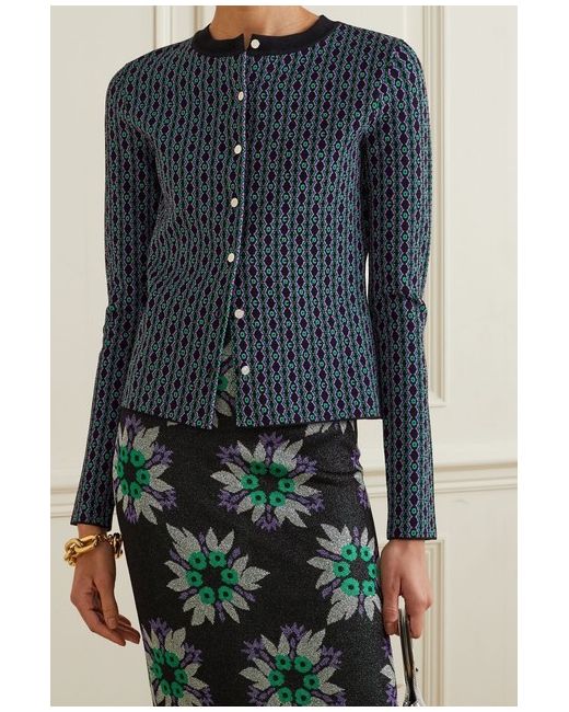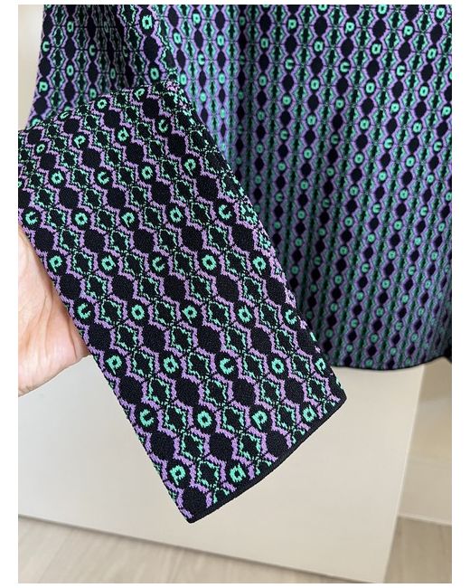 Paco Rabanne Geometric and logo-patterned stretch-knit cardigan -Brand New XS. Paco Rabanne stretch-knit cardigan 73% viscose, 15% polyester, 11% polyamide Exposed popper fastenings at front Scoop neck, long sleeves, fine knit, all-over woven geometric pattern with branding, contrasting ribbed trims, branded silver-toned buttons, straight hem Hand wash cold True to size Lightweight, stretchy RRP £490