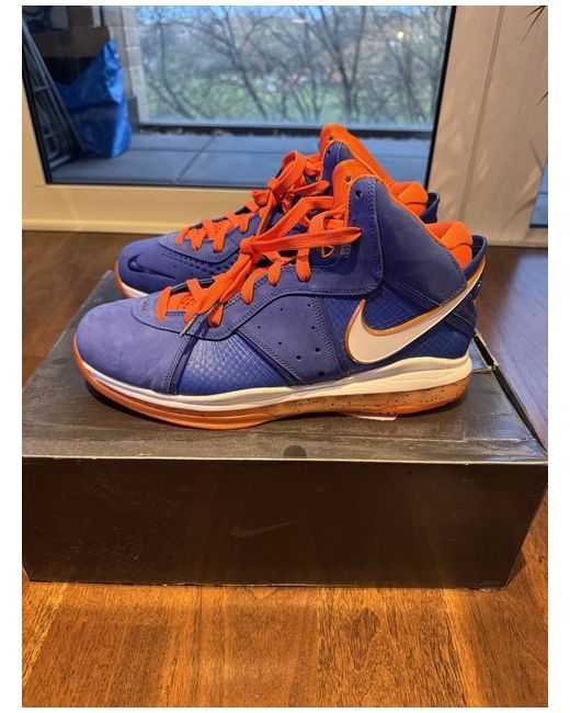 Made from leather with a lace-up closure, this sneaker features a sporty blue color and belongs to the Nike LeBron product line.