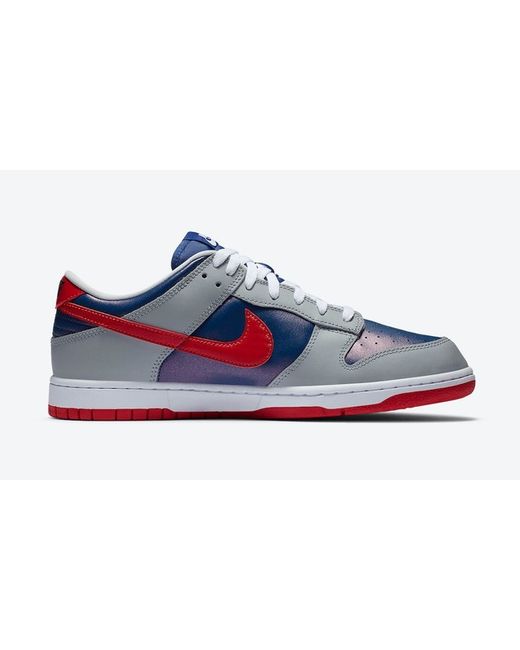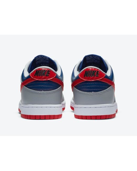 This Nike Dunk Low will look exactly like the original featuring a Hyper Blue and Silver upper detailed with a Samba Red carbon fiber Swoosh on the sides and heels. A White midsole atop a Red rubber outsole completes the design.