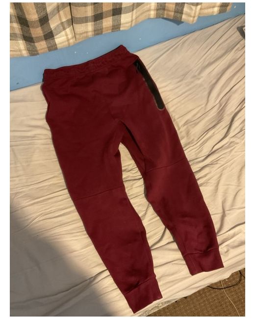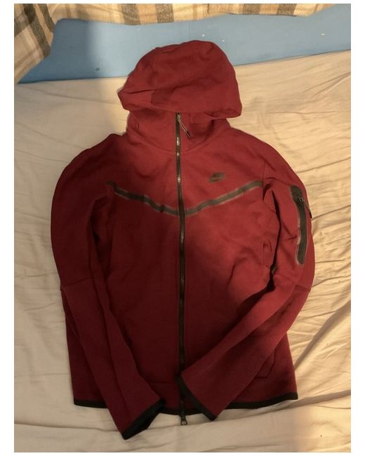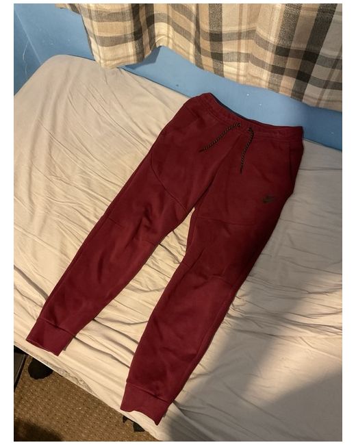 This is a new Nike Tech Fleece tracksuit for men in red. The tracksuit is made of fleece fabric and is size M. It is perfect for activewear occasions.