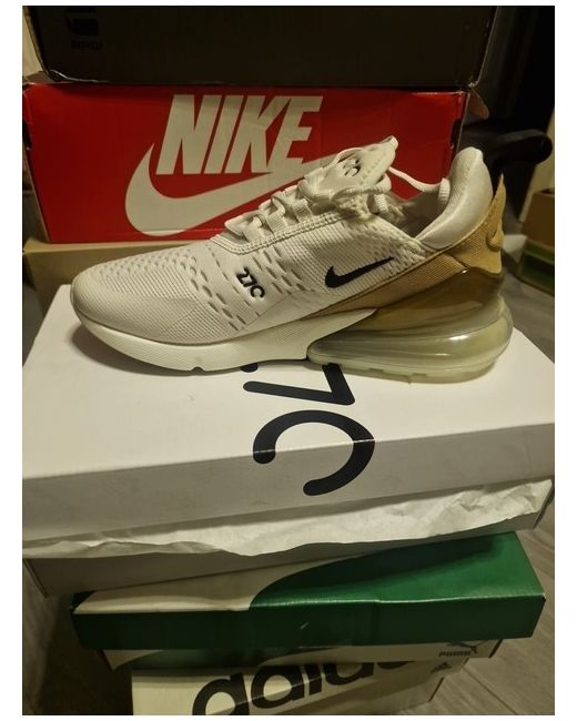 Nike Air Max 270 Size 6 in White and Gold Elevate your sneaker game with these Nike Air Max 270 trainers in size 6. With a sleek white design, these sneakers feature the iconic Nike Air product line and are perfect for any man looking for a comfortable and stylish shoe. The trainers are made by Nike, a brand known for their quality athletic wear. These Nike Air Max 270 trainers are the ideal choice for any man who wants to add a touch of style to their wardrobe. They are perfect for casual wear and are the envy of any sneaker enthusiast. Don't miss out on the chance to own a pair of these amazing sneakers.