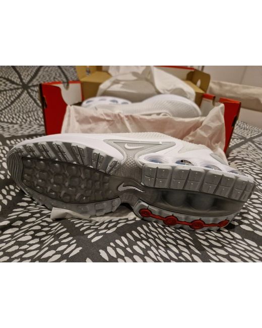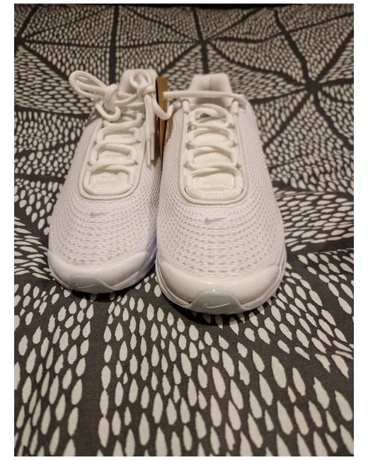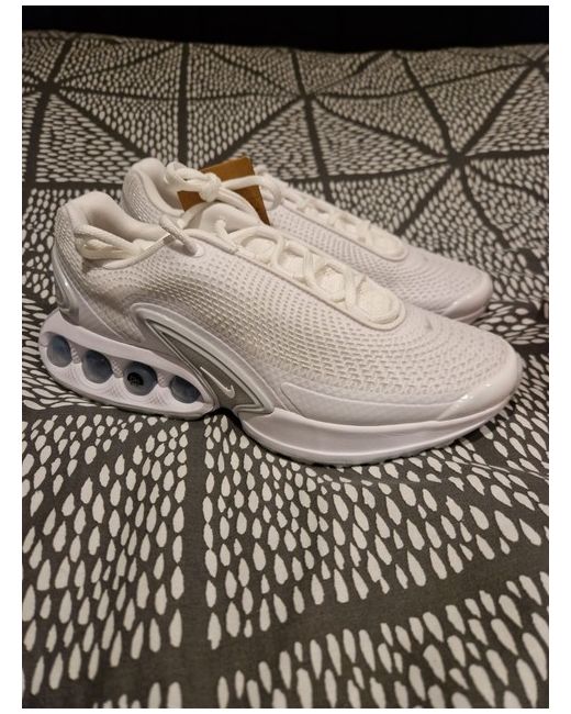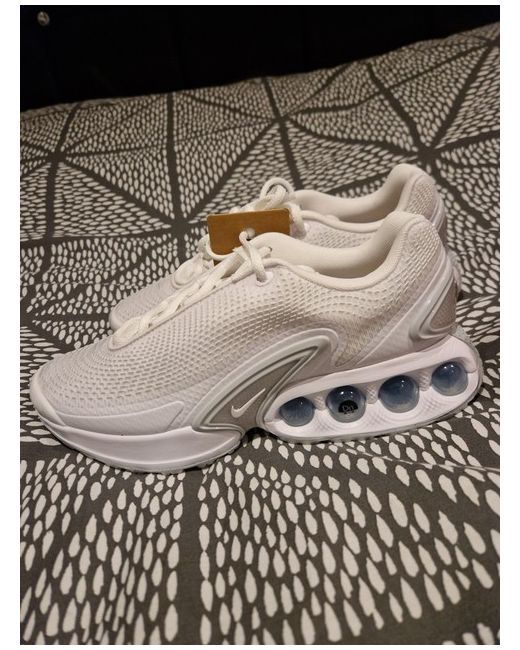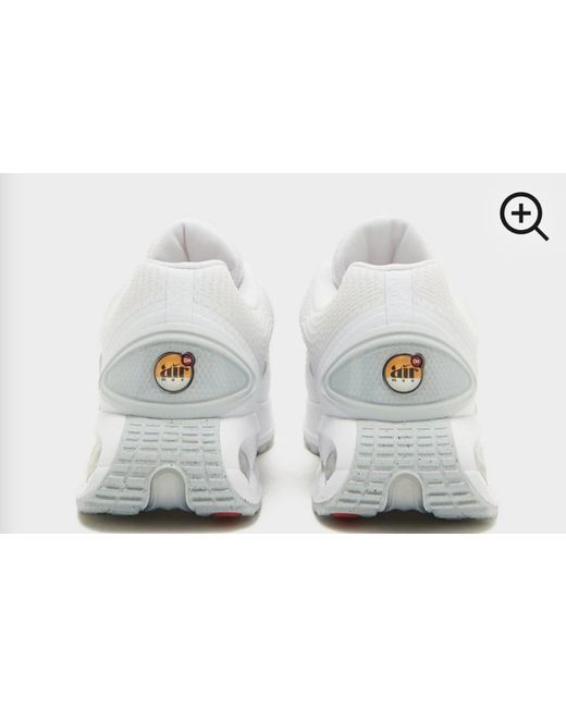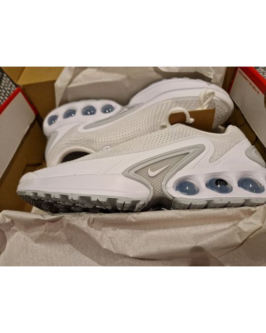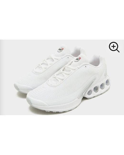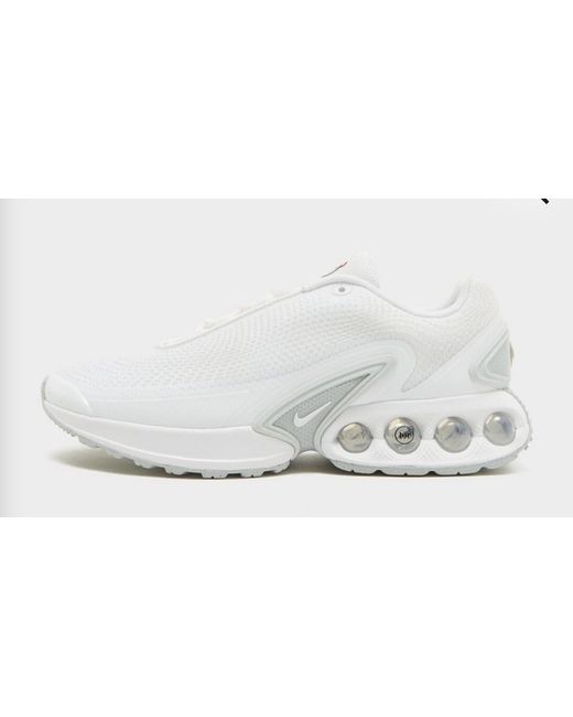 Lace up in the next generation of Air with these men's Air Max Dn trainers from Nike. Bringing Summer energy with a crisp triple White and Metallic Silver details, these treads have a multilayered mesh upper with an all-over haptic print for a textured look. They have a tonal lace fastening to lock you in, and sit atop an all-new Dynamic Air unit system. Featuring two dual-pressure tubes that shift as you step for the ultimate responsive ride, they have plush foam around the cushioning system and a grippy rubber outsole. Signed off with Nike branding throughout.