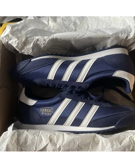 Adidas Dragon size 10 Navy Blue white stripes classic adidas colour-way Brand New Crisp trainers these are the limited edition with the Ortholite adidas insoles! Great on or even for your collection Comes with adidas box but not original box. If I still have it I will pack trainers in it but can’t guarantee.