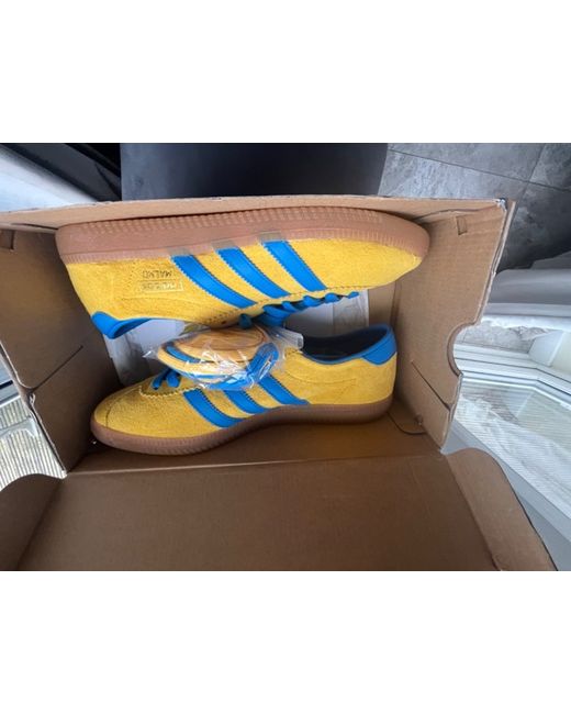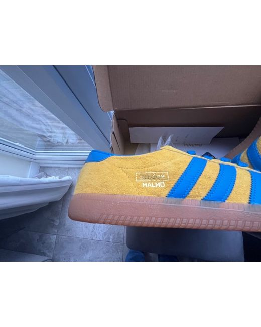 The product is a pair of yellow adidas trainers-MALMO in UK size 8.5. These trainers, suitable for men, are part of the adidas Trainer model and are designed as sneakers. With a vibrant yellow colour, these trainers are perfect for adding a pop of colour to your outfit. The size specified in the title is 9, which corresponds to UK size 8.5 in adidas sizing.