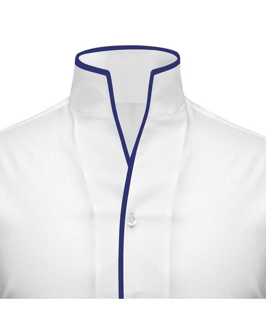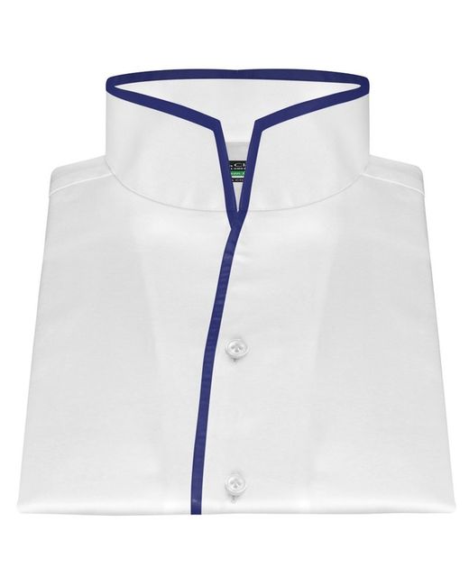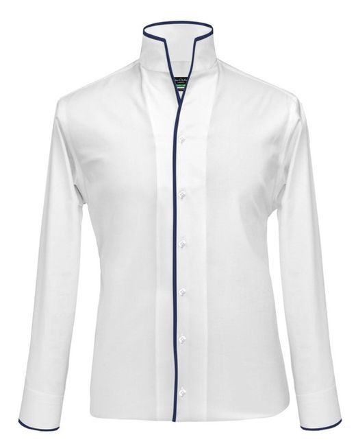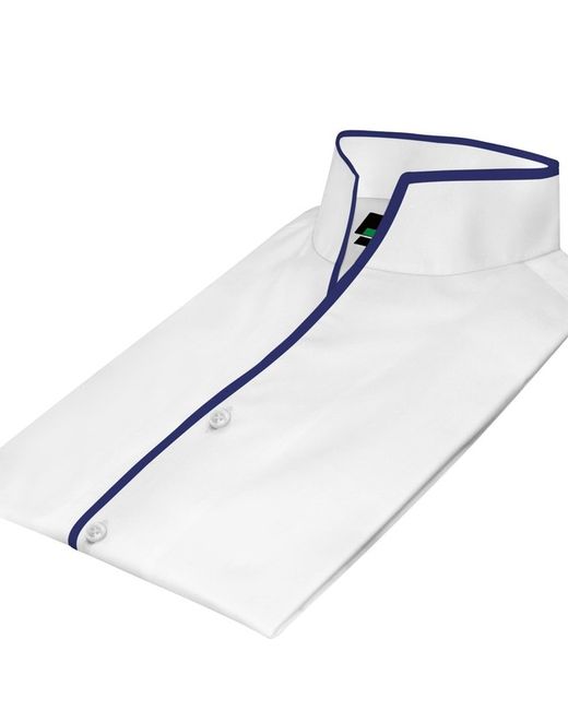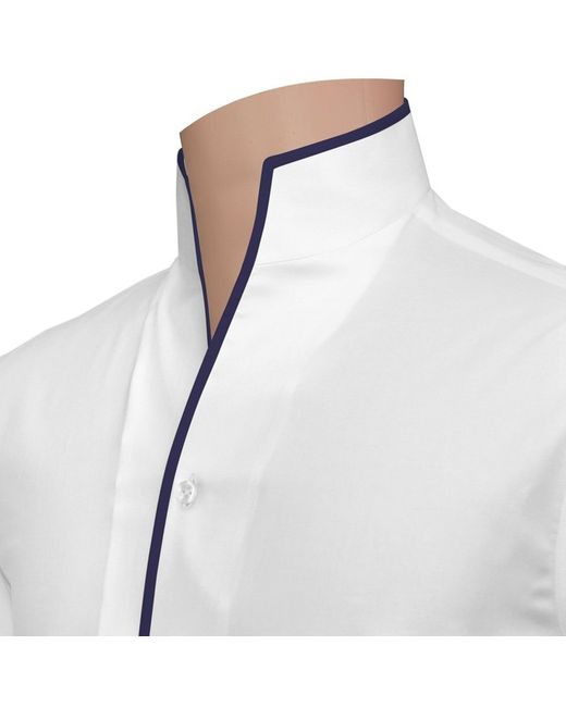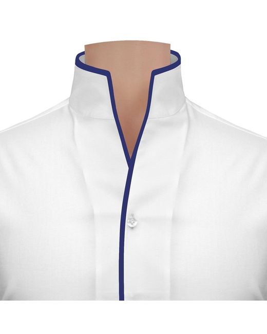 High Open V Neck / Buttonless Collar. White Cotton Shirt with Highlighted Navy Blue Piping on. Long sleeves with 4" wide Barrel cuffs - 3 buttons. John Clothier London High Open Collar Shirts. Collar and Cuff.
