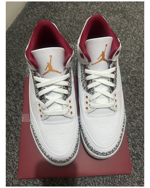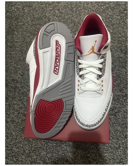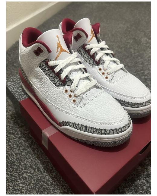 Crafted for the basketball enthusiast, the Air Jordan 3 Cardinal Red combines timeless design with modern performance. The iconic silhouette is presented in a crisp white colourway, accented by the classic Jordan logo and retro aesthetics that echo the spirit of the game's greats. The size UK 8 sneakers fit true to size, boasting a standard shoe width that ensures a comfortable experience for all-day play or casual wear. With a durable rubber outsole and a premium leather upper, these trainers are built to last. The lace-up closure secures the foot, while the non-customised, pure Jordan design remains steadfastly iconic. The 2022 release ensures that you step into the latest in sneaker technology, without sacrificing the heritage that comes with the Air Jordan product line.