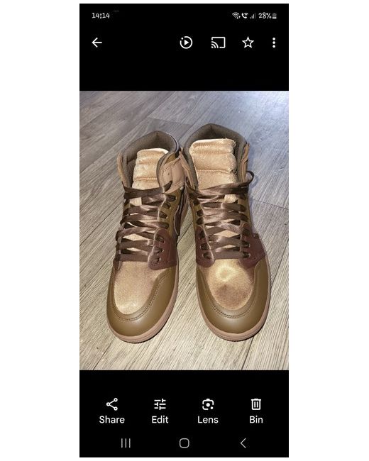 This Air Jordan 1 sneaker is a new pair in brown colour. It is a unisex trainer in size 9 UK, part of Jordan's product line. Perfect for men, this stylish shoe is a must-have for anyone looking for a trendy addition to their footwear collection. never worn, comes in original box