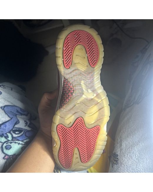 This pair of shoes is a UK size 6 Jordan 11 Retro High in red, inspired by Clifford the Big Red Dog. They are high-top trainers with a cherry theme, made of leather and part of the Air Jordan product line. The shoes were released in 2022 in the United Kingdom.