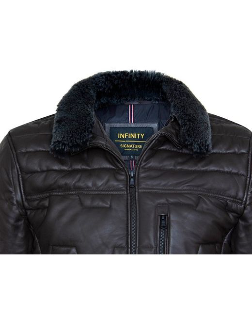 Introducing our highly anticipated Infinity Signature Range, the culmination of two years of relentless dedication to craftsmanship and innovation. Our latest masterpiece, the striking brown leather jacket, boasts generous quilted padding, making it a standout piece for cold weather environments. Crafted from sumptuously soft sheep nappa leather and featuring synthetic down filling, it ensures exceptional warmth and comfort. The removable faux fur collar lining offers versatility in styling, while the sturdy UMZ zip extending to a stand collar adds durability and sophistication. With strategically placed pockets including a vertically zipped chest pocket and two handwarmer pockets, functionality meets style effortlessly.