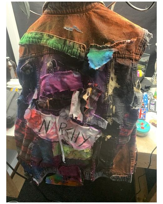 This punk jacket is a stylish and unique choice for any man's wardrobe. Made from denim with studded accents, this limited edition piece is handmade in the United Kingdom. The multicoloured design, combined with the rock and punk theme, makes it perfect for parties or cocktails. The lightweight construction and collared style make it suitable for all seasons, and the vintage look adds a touch of nostalgia to the overall design. Ideal for those who enjoy walking or skateboarding, this bodywarmer is a must-have for those looking to make a statement with their outerwear.
