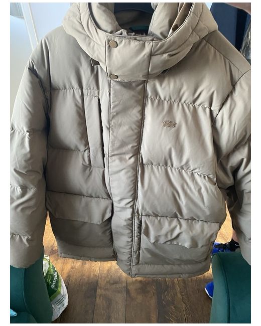 This is a Lacoste men's puffer jacket in size uk 2XL. The coat is beige in colour and made of a cotton blend material. It is designed in a regular size fit for men.