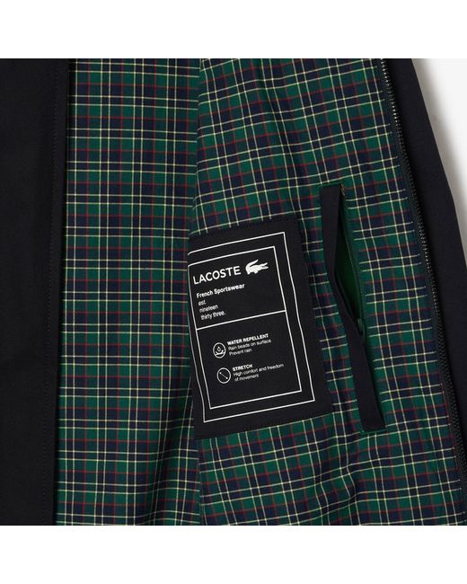 Lacoste BH7186 Harrington Jacket Lacoste Water-Repellent Twill Harrington Jacket 2 buttons at neck Checked lining Eyelets under arms for ventilation 1 zipped inside pocket Embroidered crocodile on chest Cotton (97%), Elastane (3%).