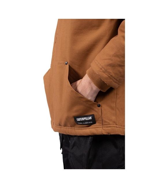 Caterpillar Hooded Sherpa Lined Jacket Bronze. Logo Label On We er's Left Hip Logo Pull At Center Front Zip Closure Logo Rivets At Corners Of Front Pouch Pockets Welt Chest Pocket With Secure Zip Closure And Logo Zipper Pull Interior Storm Cuff.