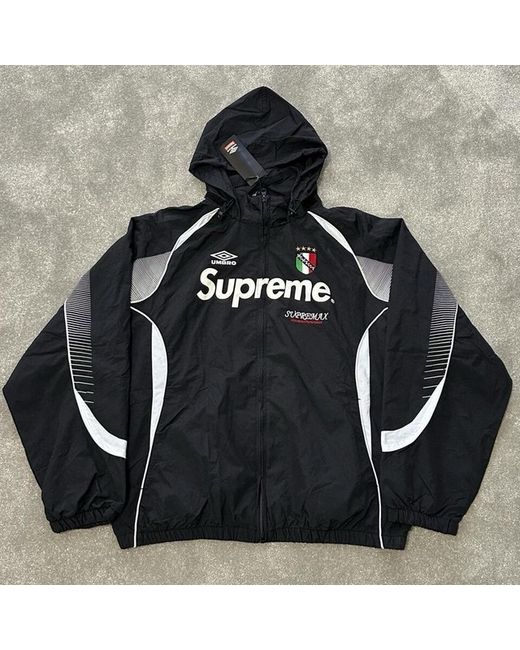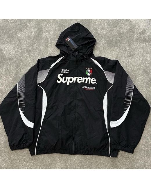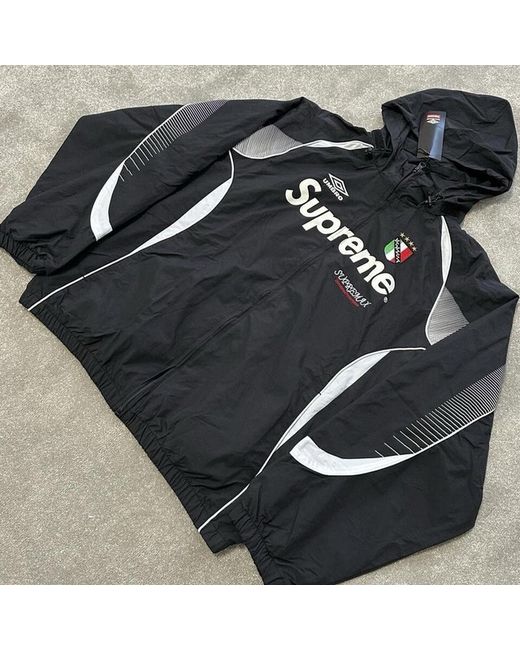 Supreme x Umbro Track Jacket 'Black' 🔥 IN SIZE XL ! Supreme Umbro Track Jacket Black water resistant with mesh and taffeta lining. Full zip closure with hand pockets on the seam in the lower front and inside chest pocket. Packable hood with internal elastic drawstring. Elasticated cuffs and bottom with contrasting panels. SIZE: XL COLOUR: BLACK WORTH £250-300, SELLING FOR ONLY £130! BRAND NEW GUARANTEED WITH TAGS, NEVER WORN BEFORE. Will ship right away in a secure package! #supreme #supremeumbro #supremejacket #umbro