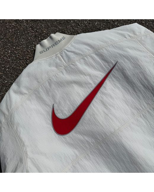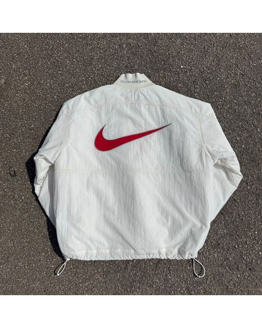 supreme x nike collaborative piece, brand new Look stylish and comfortable in this Nike Supreme Ripstop White Red Jacket. Made of high-quality nylon, this windbreaker is perfect for both men and women. The jacket is designed to keep you comfortable while you are playing sports or going out for a casual walk. The white and red colour combination is perfect for adding a touch of style to your outfit. The jacket is available in size medium and is a regular fit. This trusted seller ensures that you get the best quality product. Get your hands on this Nike Supreme Ripstop White Red Jacket now!