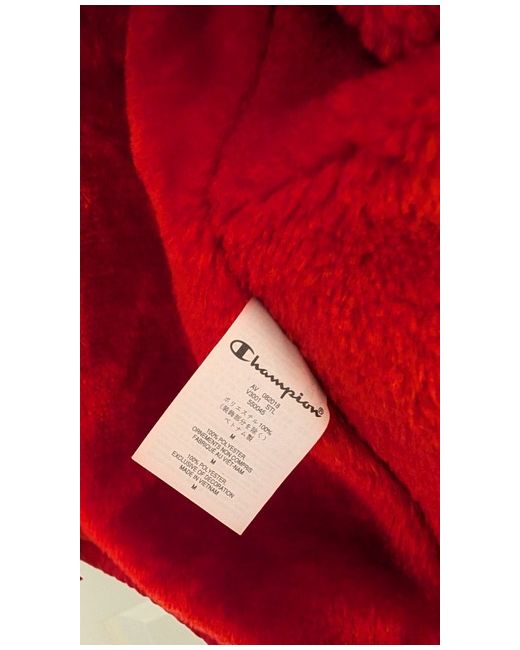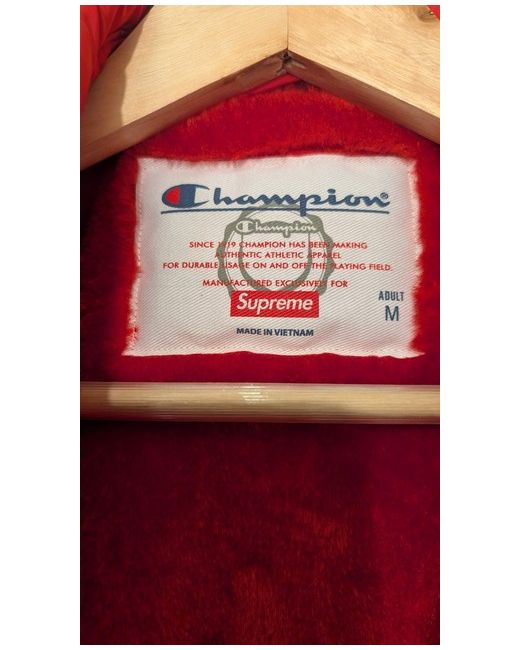 This exclusive Supreme x Champion Red Fur Lined Coach Jacket is made of polyester with a soft polyester lining, suitable for casual wear in spring. The jacket features a button and snap closure, accented with the Supreme logo. In a size M, this windbreaker style jacket is designed for men and offers insulation for added warmth. Perfect for those looking for a stylish outerwear option with a pop of colour.