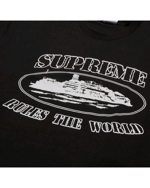 The product is a Supreme x Corteiz Rules The World Tee in the colour black and size large. This t-shirt is designed for men and falls under the regular size type category. The collaboration between Supreme and Corteiz adds a unique and stylish touch to the tee, making it a desirable item for those who appreciate streetwear fashion. The black colour gives it a versatile look that can be easily paired with different outfits, making it a great addition to any wardrobe.