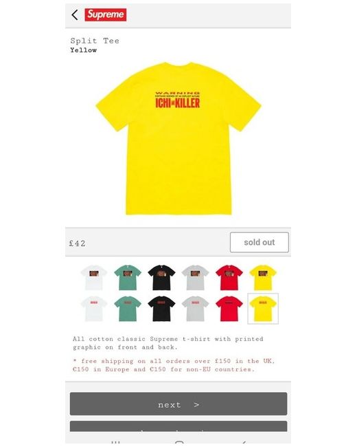 Supreme Split tee Yellow Ichi The Killer Confirmed Order . Condition is New with tags. Dispatched with Royal Mail 2nd Class.