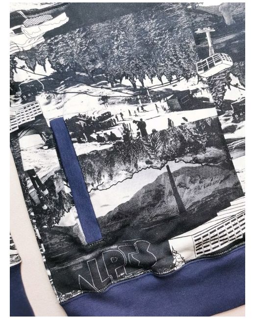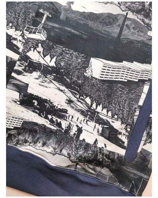 This jumper is - black and white ski print scenes. - blue trim. - 100% cotton.