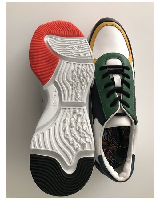 Paul Smith's running-inspired Explorer trainers arrive in multicoloured leather. A white trainer, panelled in yellow, black and green leather, they have a red rubberised heel counter and are set on an ergonomic white EVA sole.