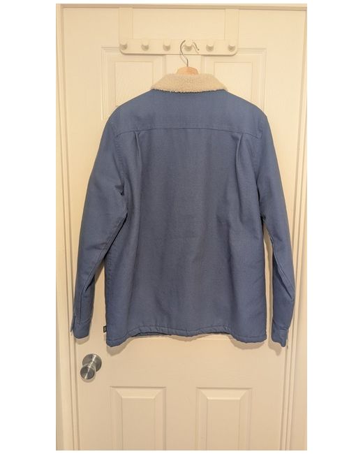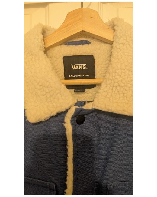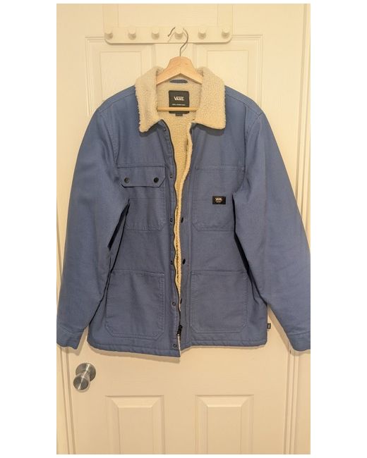 This VANS Drill Chore Jacket is a new, casual overcoat for men in a stylish blue colour. Made of cotton with a polyester lining, this jacket features a button closure, logo accents, and a canvas fabric type. It is designed for outdoor activities, with insulated polyester material providing warmth. The jacket has a collared neckline, full zip front, multiple pockets, and is suitable for walking or other outdoor pursuits. With its practical features and VANS branding, this jacket offers both style and functionality for everyday wear.