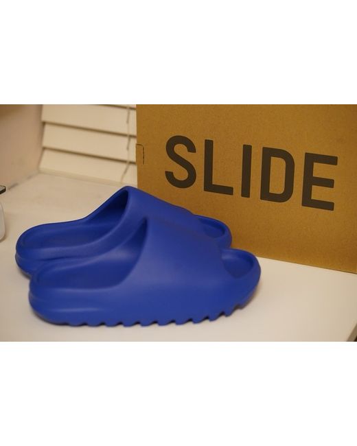 A pair of Yeezy trainers in a UK size 7, featuring a stylish blue colour and a sneaker style. These Yeezy Slides are designed for men and are perfect for casual wear or sporty activities.