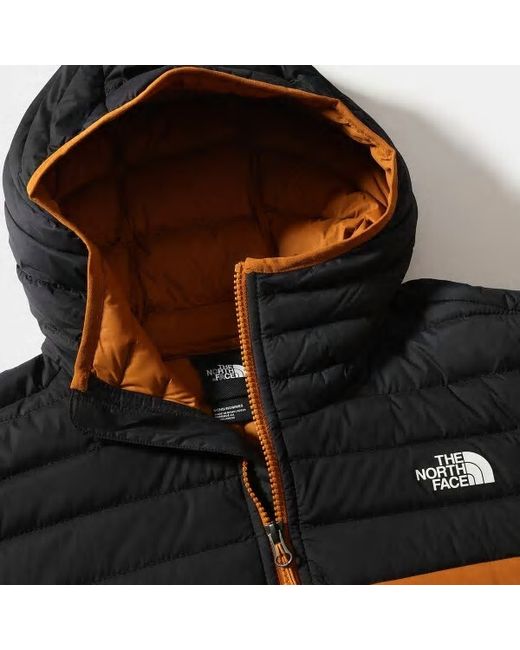 The hand pockets of this hooded jacket feature exposed, reverse-coil zippers designed to reduce snagging and improve durability. The North Face jacket is filled with 700-fill power goose down, which provides insulation while staying lightweight.