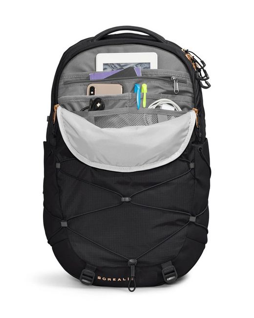 The NORTH FACE Women's Borealis Commuter Laptop Backpack in Black Rose gold is a stylish and practical choice for female travellers. With a sleek design featuring a buckle embellishment and a soft shell construction, this backpack offers both style and functionality. The backpack has a spacious interior with three compartments and seven pockets, making it perfect for carrying all your essentials while on the go. The polyester lining ensures durability, and the compression straps provide a comfortable fit. Whether you're heading to school or on a hiking or trekking adventure, this backpack is the perfect companion.