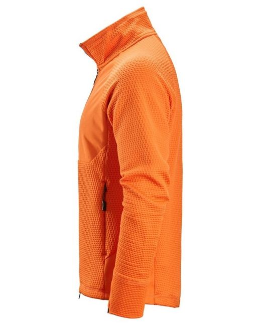 Snickers 8404 FlexiWork, Midlayer Jacket warm orange Warm, light and versatile midlayer jacket built for active work. Clean design with space for profiling. Double-knit thermal fabric Softshell windproof fabric at chest 2-way front zipper Concealed zip side pockets Inner stow pockets Material Main: 94% recycled polyester, 6% elastane, 289 g/m2.