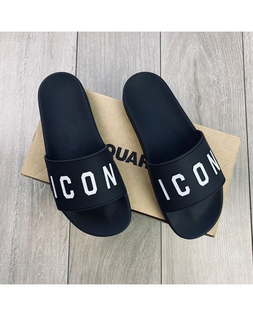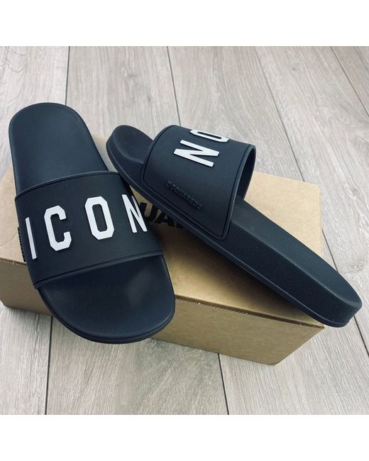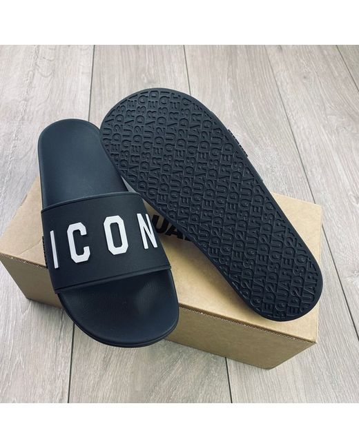 Black DSQUARED2 rubbers slides with 3D white ICON logo print. Product code: FFM0023 17203516 2124.