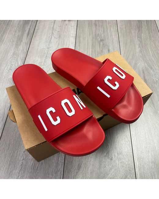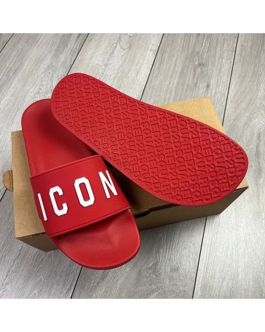 Red DSQUARED2 rubbers slides with 3D white ICON logo print. Product code: FFM0023 17203516 4065.