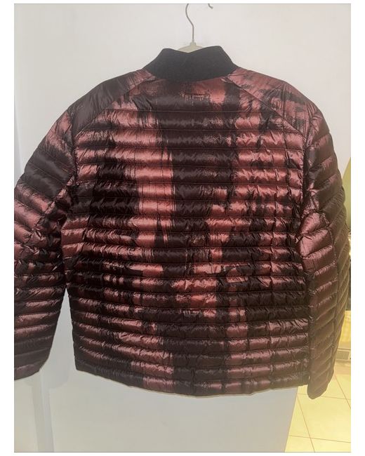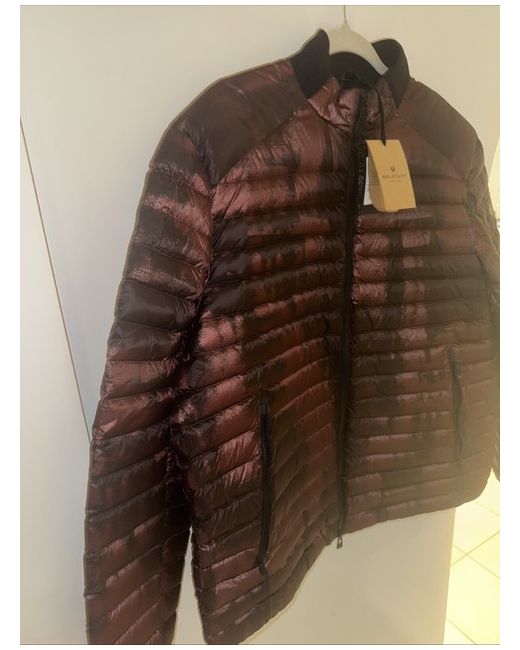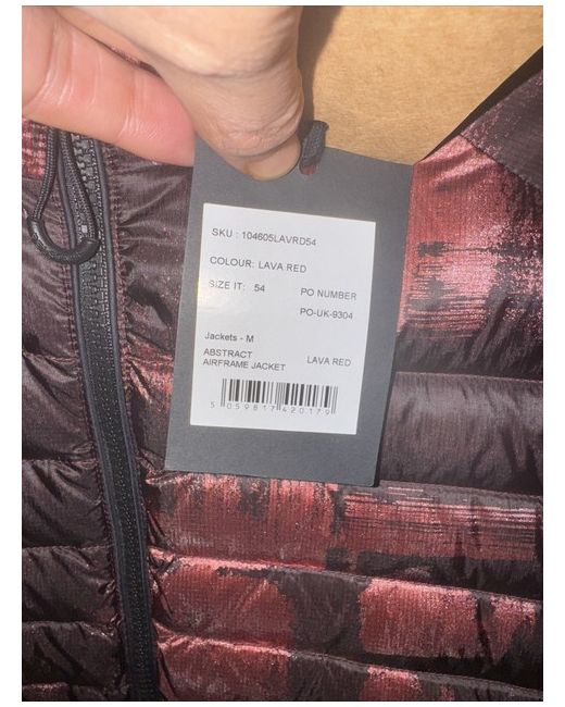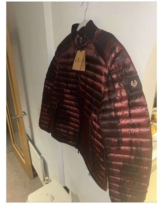 This Belstaff Airframe Down Puffa Jacket in Abstract Lava Red features a Nylon outer shell with Down insulation, offering a lightweight and warm feel. The jacket is a short bomber style with a zip closure, available in size 2XL (UK44). The classic design and black colour make it a stylish choice for men.