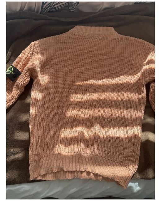 The Stone Island knitted jumper is a stylish addition to any man's wardrobe. Made from a high-quality knit fabric in a vibrant orange colour, this jumper is both fashionable and comfortable. With a regular fit and size L, it is suitable for everyday wear. The branded Stone Island logo adds a touch of luxury to this classic wardrobe staple.