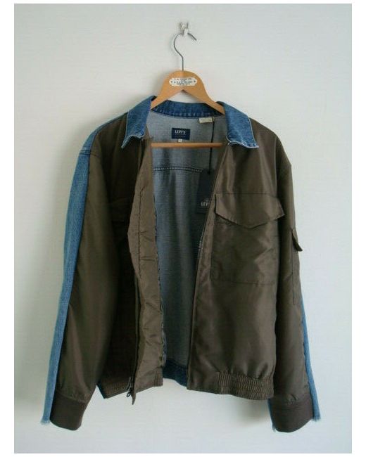 A fusion of two classic silhouettes - the bomber and the denim jacket. The bomber section, front and front of sleeves, is a dark olive green colour; the trucker section, back and back of sleeves, is a classic lightly washed denim blue.