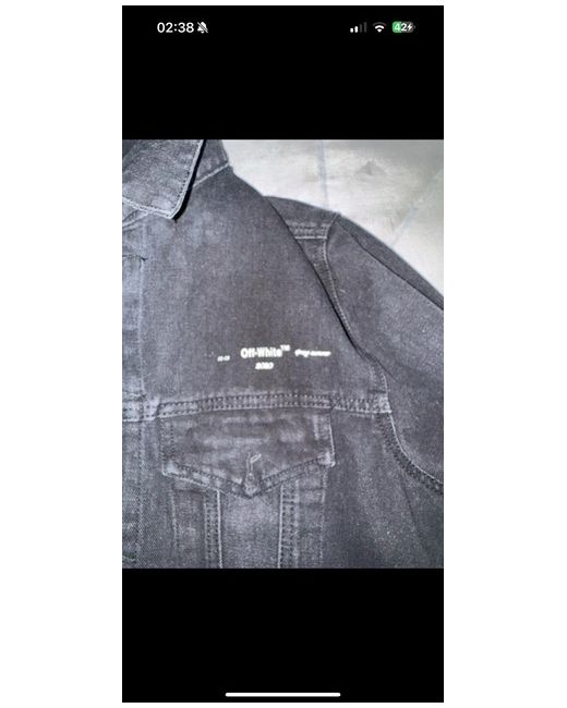 This Off-White denim jacket for men is brand new without tags. It is an XL size, made of black cotton with a denim fabric type. The style is an overcoat, suitable for regular-sized men.