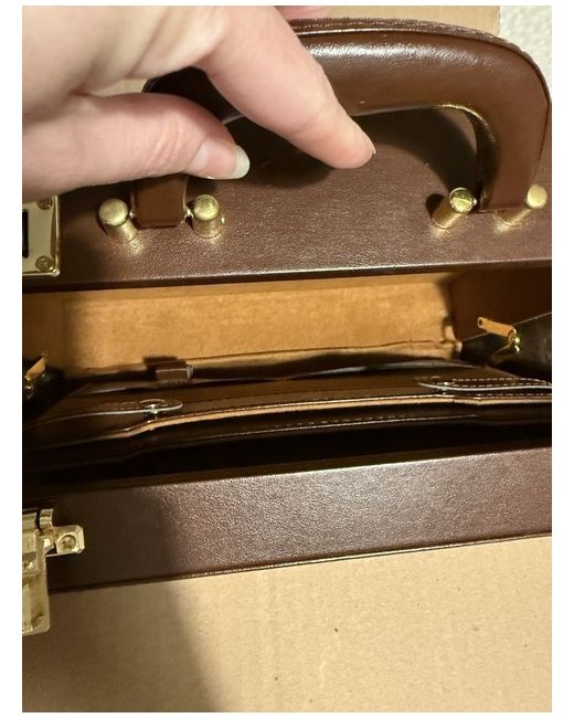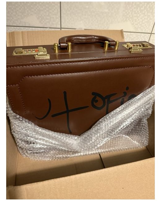 Travis Scott Utopia Briefcase. This limited-edition piece blends Travis's iconic style with everyday practicality. Crafted from high-quality leather and lined with soft suede, this briefcase is the perfect addition in authentic street fashion. This briefcase is an official album merchandise, making it a must-have for any Travis Scott fan! Measuring 14" x 10 3/4", this brown leather briefcase is the perfect size to carry all your essentials without being too bulky. Whether you're heading to work or running errands, this briefcase is the ultimate style statement.