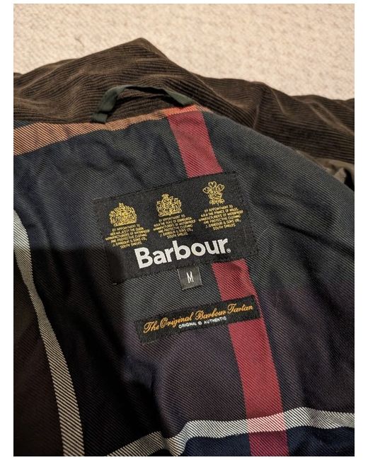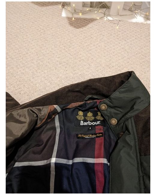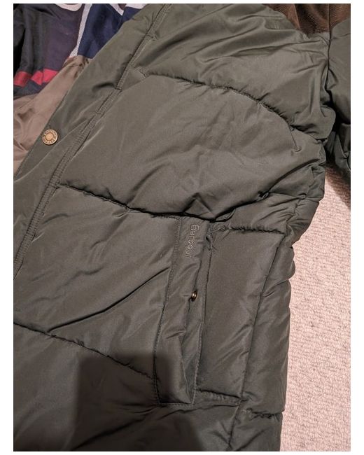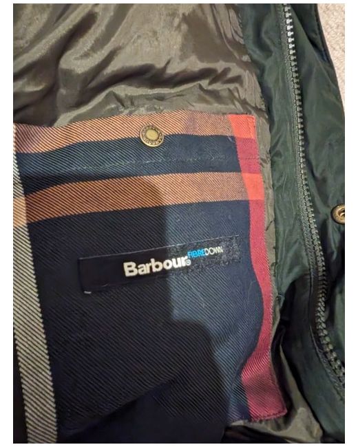 Barbour padded jacket, in medium....I am 6ft 4 and it fits me perfectly....although it is a medium?? Worn once inside and I took the tags off, been in a box ever since!!!