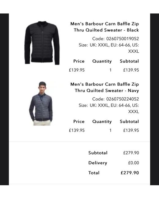 I have 2 Barbour Carn zip up jackets for sale. I have listed them as new without tags, however the blue one has been worn about 4 times. The black one is brand new. The 3XL is just a little too big for me and so they are up for sale. I have included a picture of my order screen so you can see what they cost. They are a nice jacket but in this instance just too big. A great addition to the wardrobe for the cool spring evenings. From a pet and smoke free home.